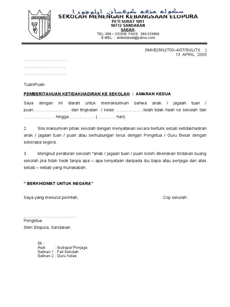 Contoh surat amaran ponteng sekolah rendah contoh surat bagi murid yang terlibat dalam salah laku mereka boleh dikenakan beberapa bentuk hukuman mengikut jenis. Proses dan cetak surat amaran ponteng pertama. Keluarkan surat amaran kepada staf dan salinkan surat.
